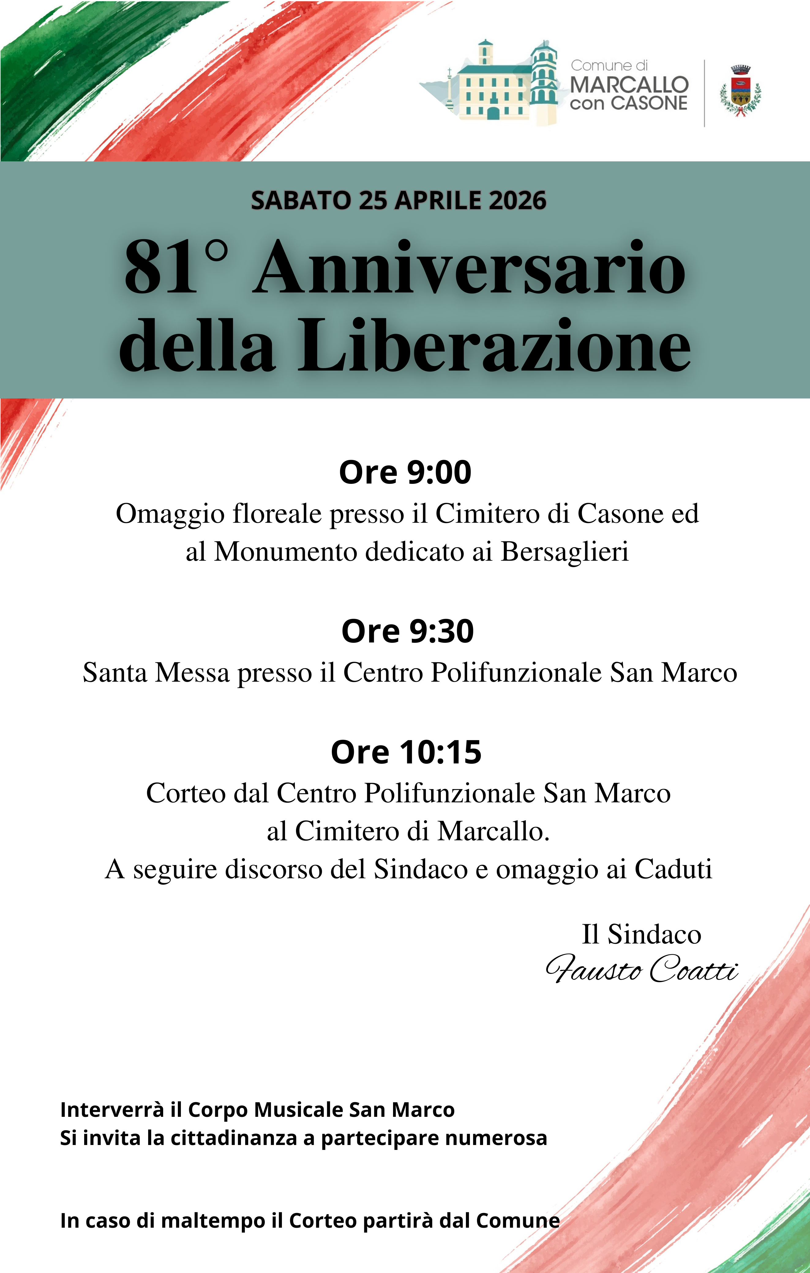 L’Amministrazione comunale invita la cittadinanza a partecipare alle celebrazioni per l’81° Anniversario della Liberazione, in programma sabato 25 aprile 2026.