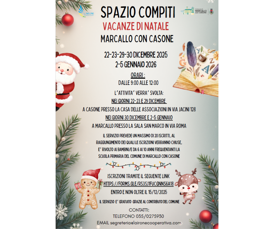 Il Comune è lieto di presentare “Spazio Compiti – Vacanze di Natale”, un’iniziativa dedicata ai bambini e alle bambine della scuola primaria per accompagnarli in momenti di gioco educativo, socializzazione e supporto allo studio durante il periodo delle festività natalizie.