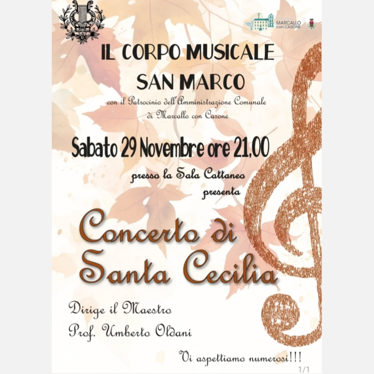 L’Amministrazione Comunale informa la cittadinanza che sabato 29 novembre, alle ore 21.00, presso la Sala Cattaneo, si terrà il tradizionale Concerto di Santa Cecilia eseguito dal Corpo Musicale San Marco.
