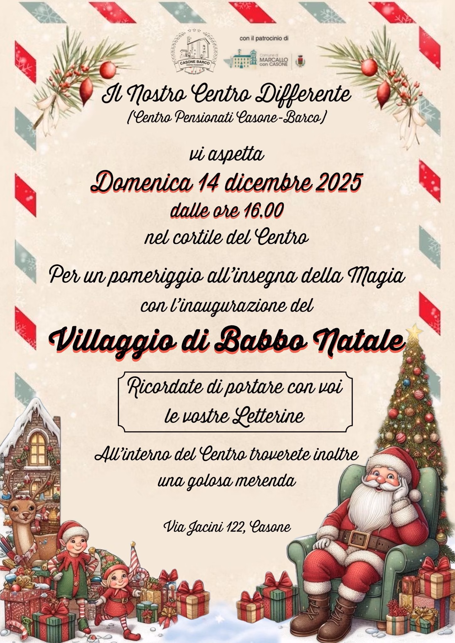 Il Comune e il “Centro Pensionati Casone-Barco” sono lieti di invitare tutta la cittadinanza alla festa di inaugurazione del Villaggio di Babbo Natale, che si terrà domenica 14 dicembre 2025 a partire dalle ore 16:00 nel cortile del Centro.